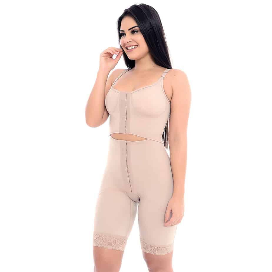 Modelador short com busto bipartido, possui alças finas ou largas, sendo fixas e reguláveis, reforço com tecido duplo na região do abdômen até o quadril, abertura na região da virilha para facilitar suas necessidades fisiológicas.